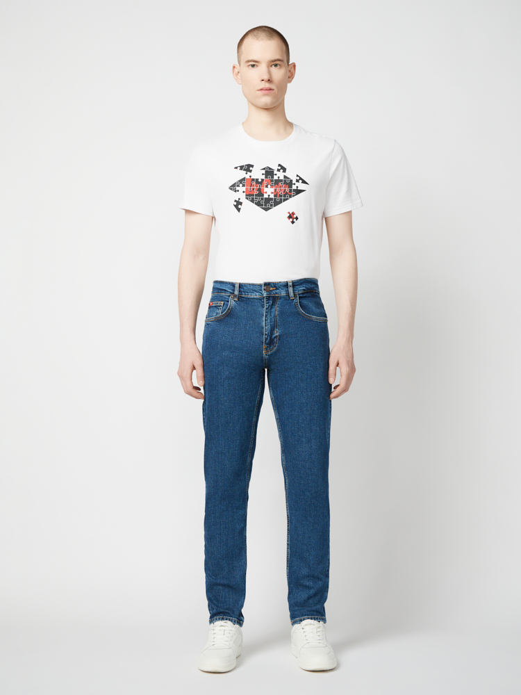 Мужские джинсы прямого прилегающего кроя - это отличный выбор для тех кто ищет комфортный вариант для ежедневной носки. Джинсы выполнены из высококачественного хлопка с добавлением эластана, что обеспечивает идеальную посадку и свободу движений. Прямой крой и свободная посадка от бедра , делает эти джинсы универсальными и подходящими для любого типа фигуры. Модель имеет зауженный силуэт, среднюю посадку по талии и ширинку на молнии . Эта модель отлично сочитается с любой футболкой или рубашкой и станут незаменимой частью гардероба