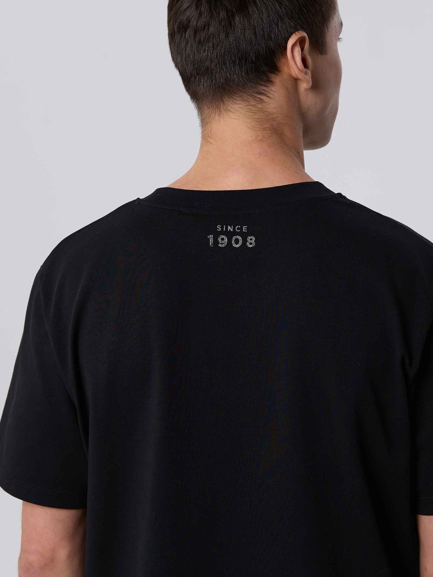 Чёрная футболка классического кроя из натурального хлопка. Комфортная посадка, аккуратный силуэт и выразительный принт на груди. Универсальная базовая вещь, которая легко вписывается в любой гардероб.